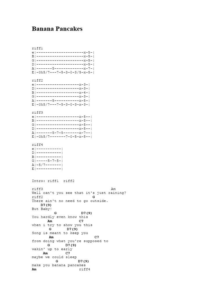 Jack Johnson Banana Pancakes PDF Banana Pancakes Pdf banana pancakes chords. 2 teaspoons baking powder 1⁄2. 2 tablespoons (light or dark) brown sugar. Make a batch for breakfast today! fluffy on the inside, crispy on the outside, and delicately flavored with bananas. this banana pancakes recipe yields fluffy pancakes with crisp edges and big banana flavor. 1,654,531 views, added to favorites 88,698 times. • 2. Banana Pancakes Pdf.